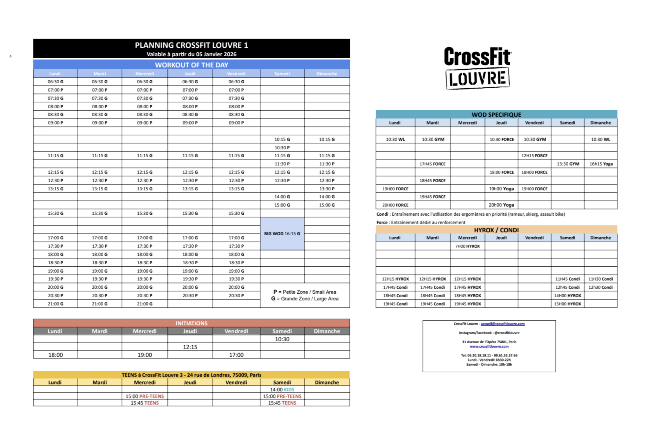 Horaires hebdomadaires — consultation uniquement. Réservations via Resawod une fois le compte configuré.