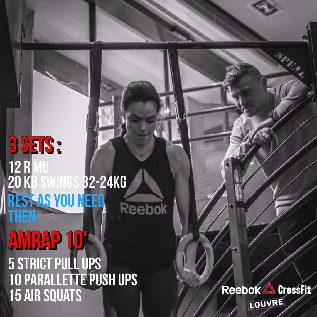 La première partie de notre entrainement sera orientée sur l’amélioration des ring MU. Pratiquez les adaptations en partant du sol.Le KB Swings sera une pré-fatigue