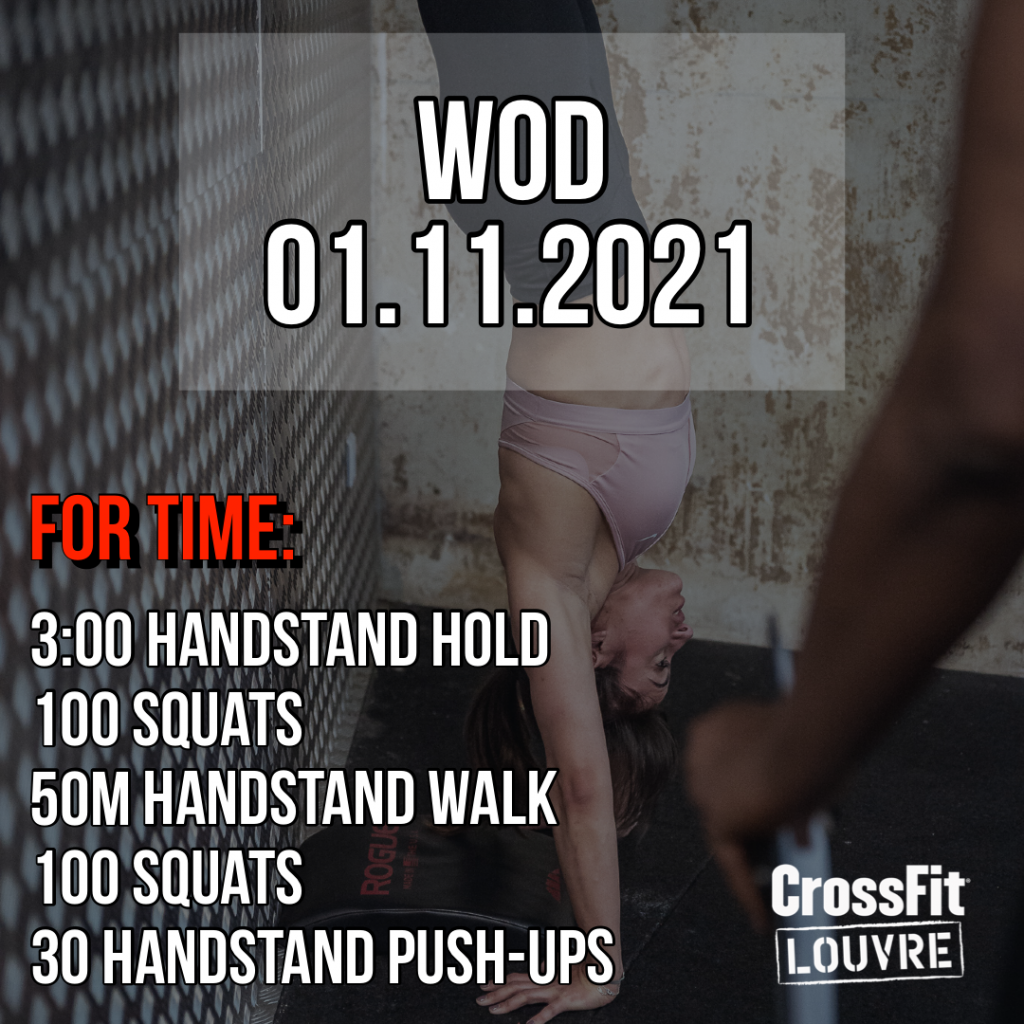 FOCUS: Tout d’abord, sur le Handstand Hold. Concentrez vous sur l’alignement entre les épaules et les hanches durant tout le mouvement. Ensuite, sur les Air Squats. Concentrez vous sur l’amplitude complète de mouvement. Ensuite, sur le Handstand Walk. Veillez à vous concentrer sur l’activation des épaules et la flexion minimum de bras. Puis, sur les HSPU. Faites un focus sur le tripod en position basse du mouvement ainsi que sur l’alignement en fin de répétition entre les hanches et les épaules.