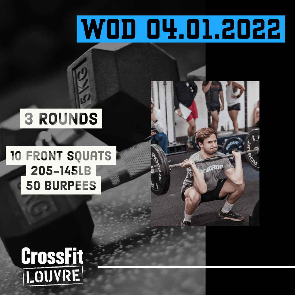 OBJECTIFS: Après les tirages de Lundi, c’est parti pour de la poussée. Adaptez la charge afin d’effectuer les Front Squats en deux sets max. Sur les Burpees, keep it steady!