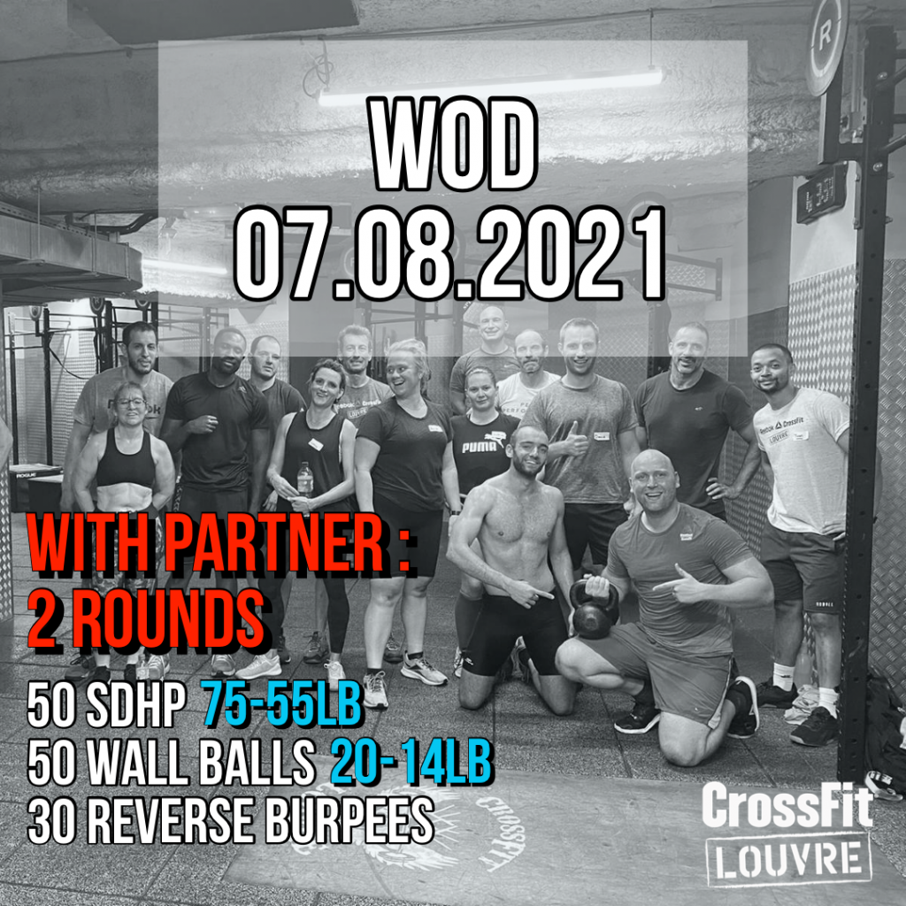 Focus: Tout d’abord, sur les Sumo Deadlift High Pull. Concentrez vous sur l’extension de hanches avant le tirage. Ensuite, sur les Wall Balls. Faites un focus sur l’amplitude de mouvement complète et l’extension de hanche avant le lancer. Enfin sur les Reverse Burpees.  Veillez à envoyer fort les jambes vers l’avant au moment de vous redresser.