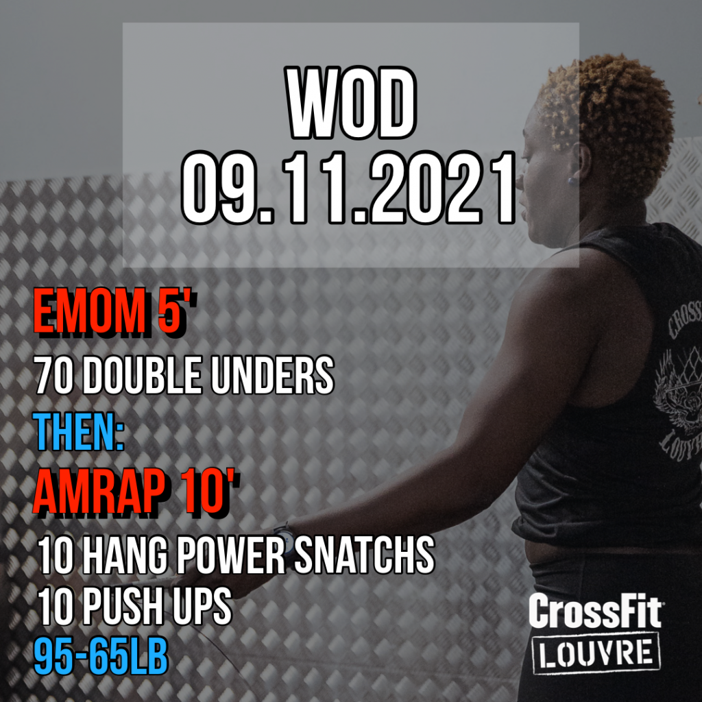 FOCUS: Tout d’abord, sur les Double Unders. Concentrez vous sur la rotation des poignets, le rebond des pieds au sol… Bref regardez nos deux vidéos tutos sur les Double Unders. Ils n’auront plus de secret pour vous! Ensuite, sur le Hang Power Snatch. Faites un focus sur le saut avant la réception avec le poids du corps dans les talons. Enfin, sur les Push Ups. Veillez à vous concentrer sur l’alignement entre les épaules et les hanches ainsi que sur les coudes proches des côtes.