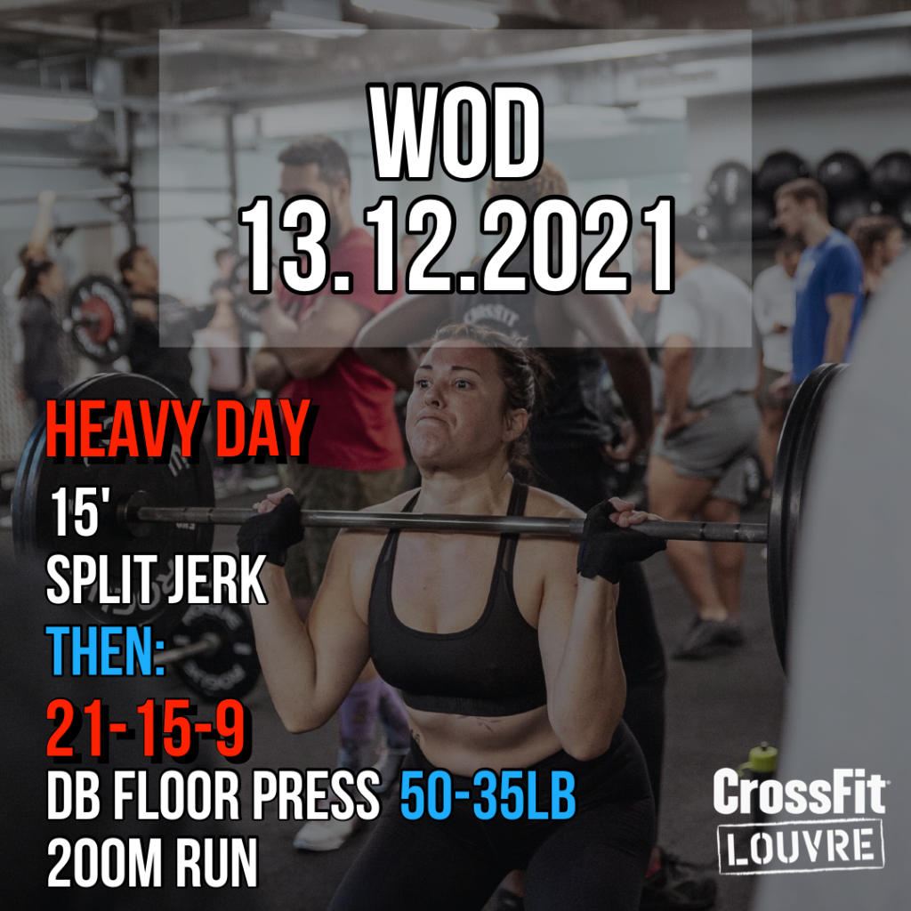 FORMAT: Heavy Day. Vous devrez soulever la charge la plus lourde possible selon votre forme du jour. For Time. Vous devrez effectuer les mouvements et répétitions demandés le plus rapidement possible.