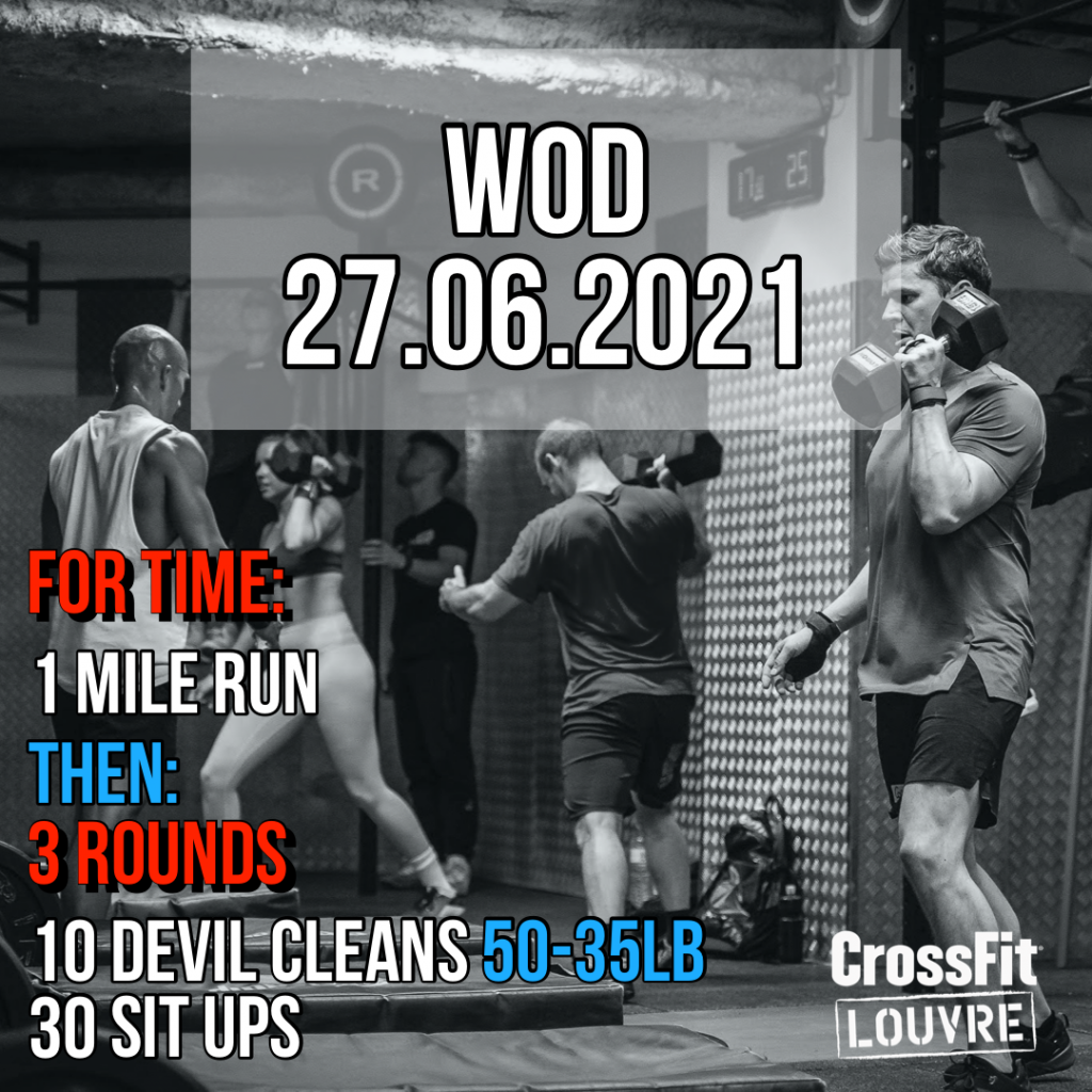 Focus: Tout d’abord, sur la course. Faites un focus sur le fait de ne pas poser les talons au sol. Ensuite, sur les Devil Cleans. Veillez à vous concentrer sur le retour du Burpee avec les pieds de part et d’autre de la charge tout en maintenant le dos neutre. Enfin, sur les Sit Ups. Veillez à vous concentrer sur le retour du Burpee avec les pieds de part et d’autre de la charge tout en maintenant le dos neutre.