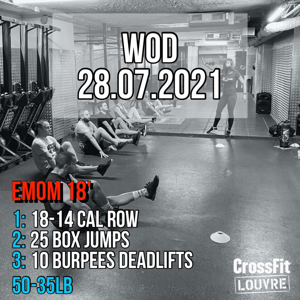 Focus: Tout d’abord, sur le rameur. Veillez à vous concentrer sur la poussée forte des jambes avant le tirage. D’autre part, sur la position de retour, pensez à avoir les épaules en avant des hanches, tout en conservant le dos droit. Ensuite sur les Box Jumps. Veillez à vous concentrer sur le rebond au sol afin d’aller plus vite sur vos répétitions. Enfin, sur les Burpees Deadlifts. Concentrez vous sur le retour du burpee avec le dos neutre et les pieds bien à plat.