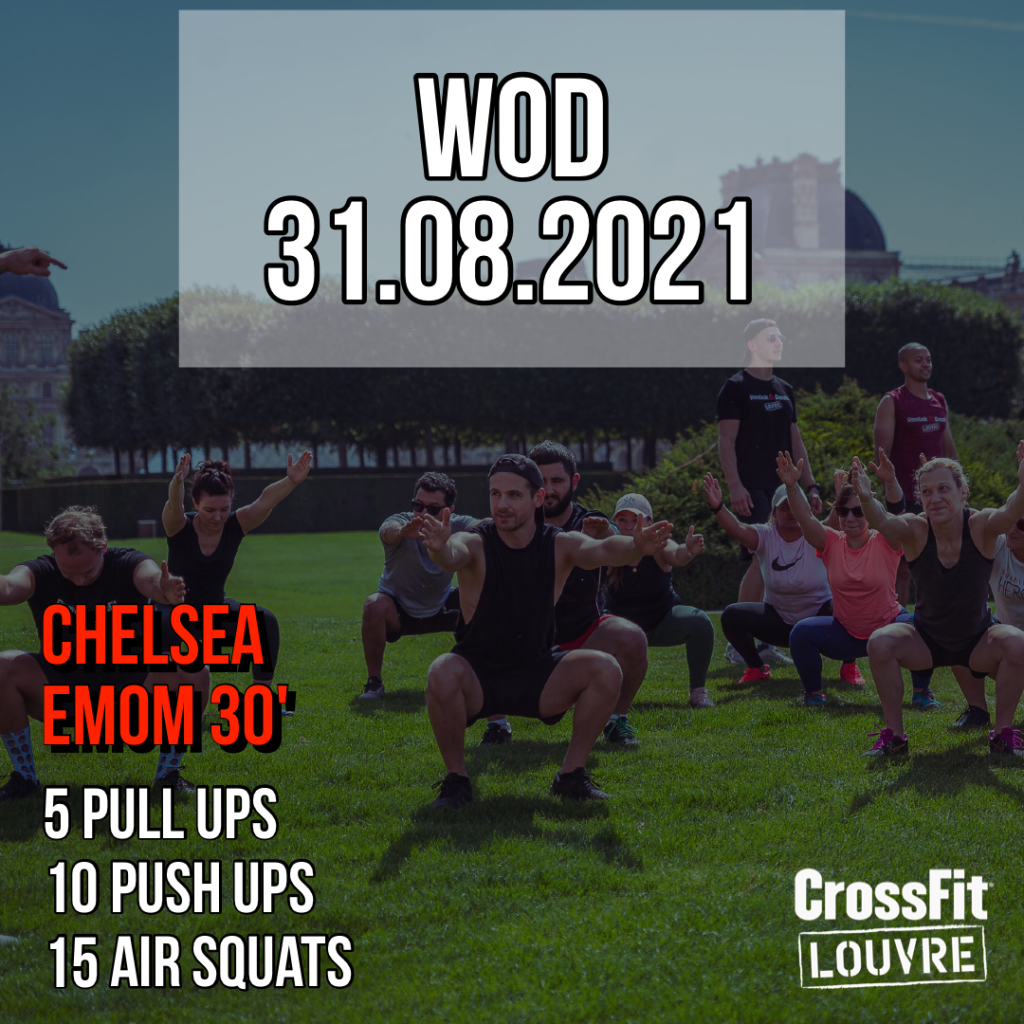 Focus: Tout d’abord, sur les Pull Ups. Concentrez vous sur l’amplitude complète de mouvement tout en maintenant un kipping efficient. Ensuite, sur les Push Ups. Veillez à utiliser conserver l’alignement entre les épaules et les hanches durant tout le mouvement. Enfin, sur les Air Squats. Faites un focus sur l’amplitude de mouvement et le buste droit durant le mouvement.