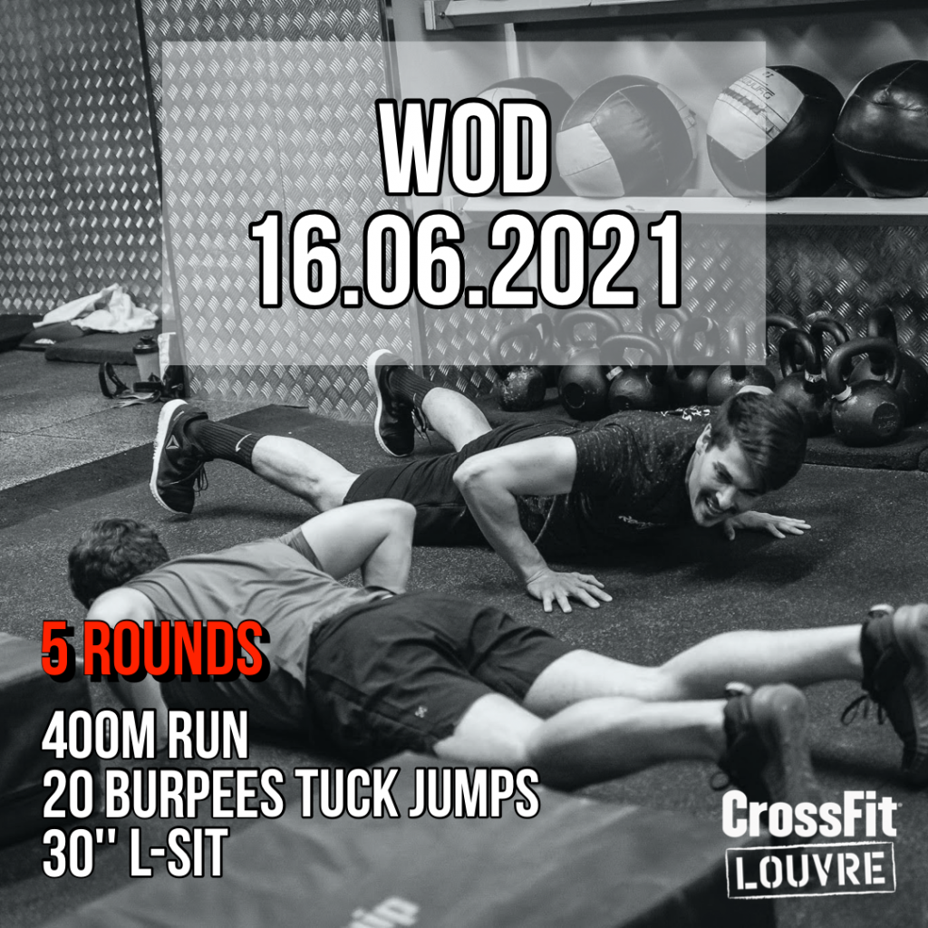 Focus: Tout d’abord, sur la course. Concentrez vous sur le fait de poser le moins possible les talons au sol. Ensuite, sur les Burpees Tuck Jump. Veillez à vous concentrer sur la cadence de vos répétitions afin de maintenir un rythme cardiaque « gérable ». Enfin sur le L-Sit. Faites un focus sur le fait de repousser les épaules loin des oreilles tout en conservant ces dernières alignées avec les hanches.